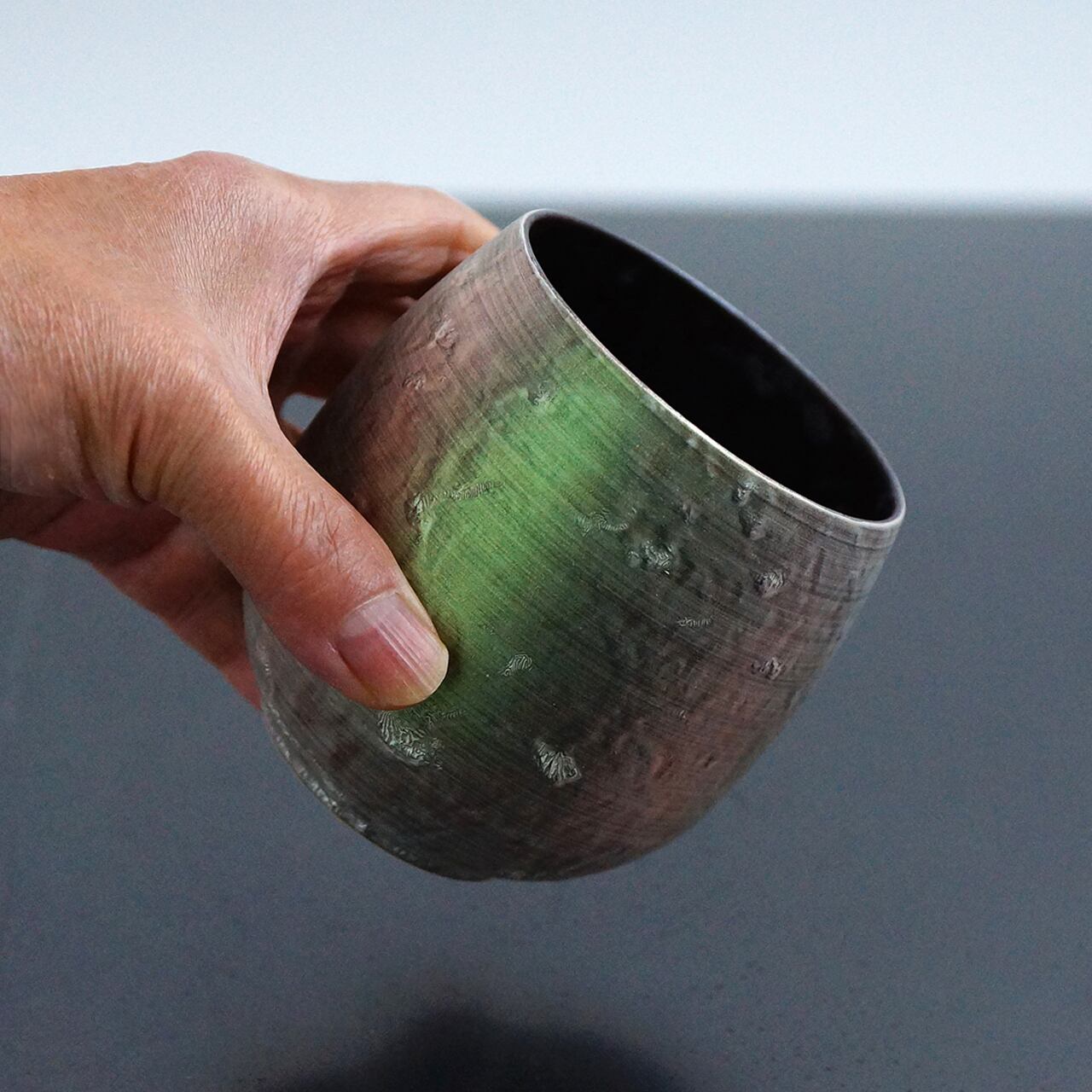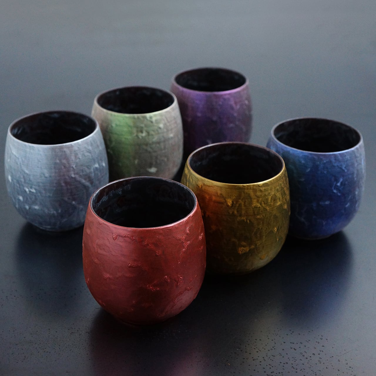 見る角度によって色味が変わり、パールの光が美しい色を発し、非日常の空間と癒しをもたらします。目線で変わる光と影のコントラストを、ぜひ手に取って楽しんでいただきたいカップです。手作業のため、表面の凹凸や色合い、筆の刷毛あとなど、一つ一つ異なります。予めご了承くださいませ。